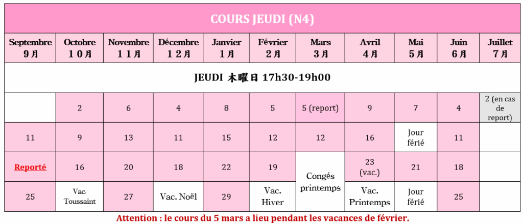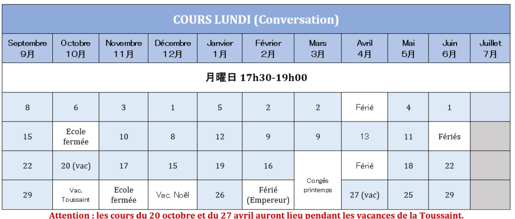 Vous trouverez ici les différents calendrier des cours de l’année en fonction du niveau choisi. (Vous recevrez un calendrier par email une fois votre classe validée)